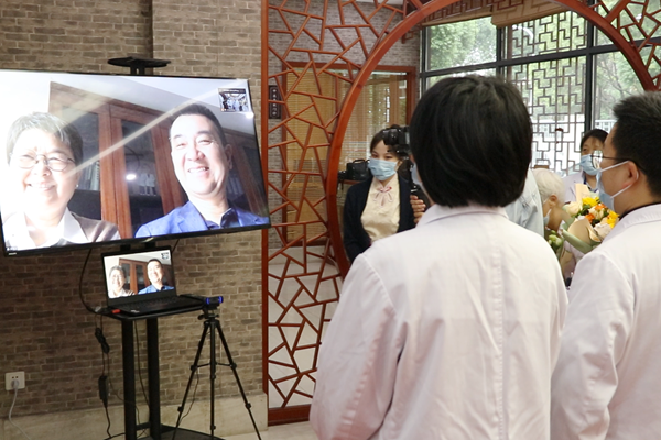 ▶拜师仪式:跟师学员代表向老师献花,指导老师代表向学员赠书。两位因特殊原因无法来到现场的南中医老师也通过连线实现了与自己学员的亲切互动。