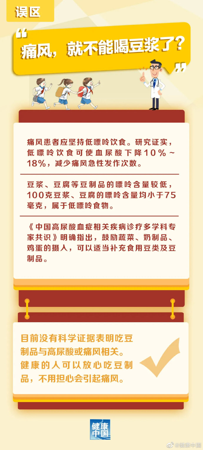 有些人说痛风是吃出来的,如果不吃海鲜,不喝啤酒,就不会得痛风;有些人说得了痛风就不能喝豆浆了……戳图了解↓↓↓