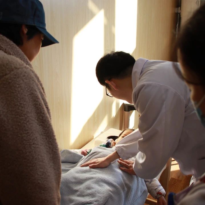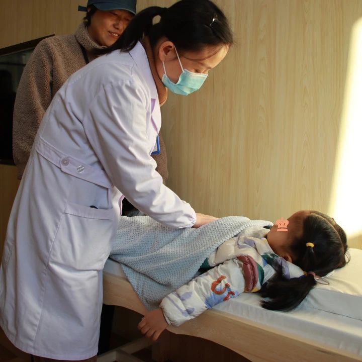 圆圆正好有点积食,躺在小治疗床上接受治疗。在宦医生的指导下,治疗师为她细心推拿。家长和老师在旁全神贯注地学习。